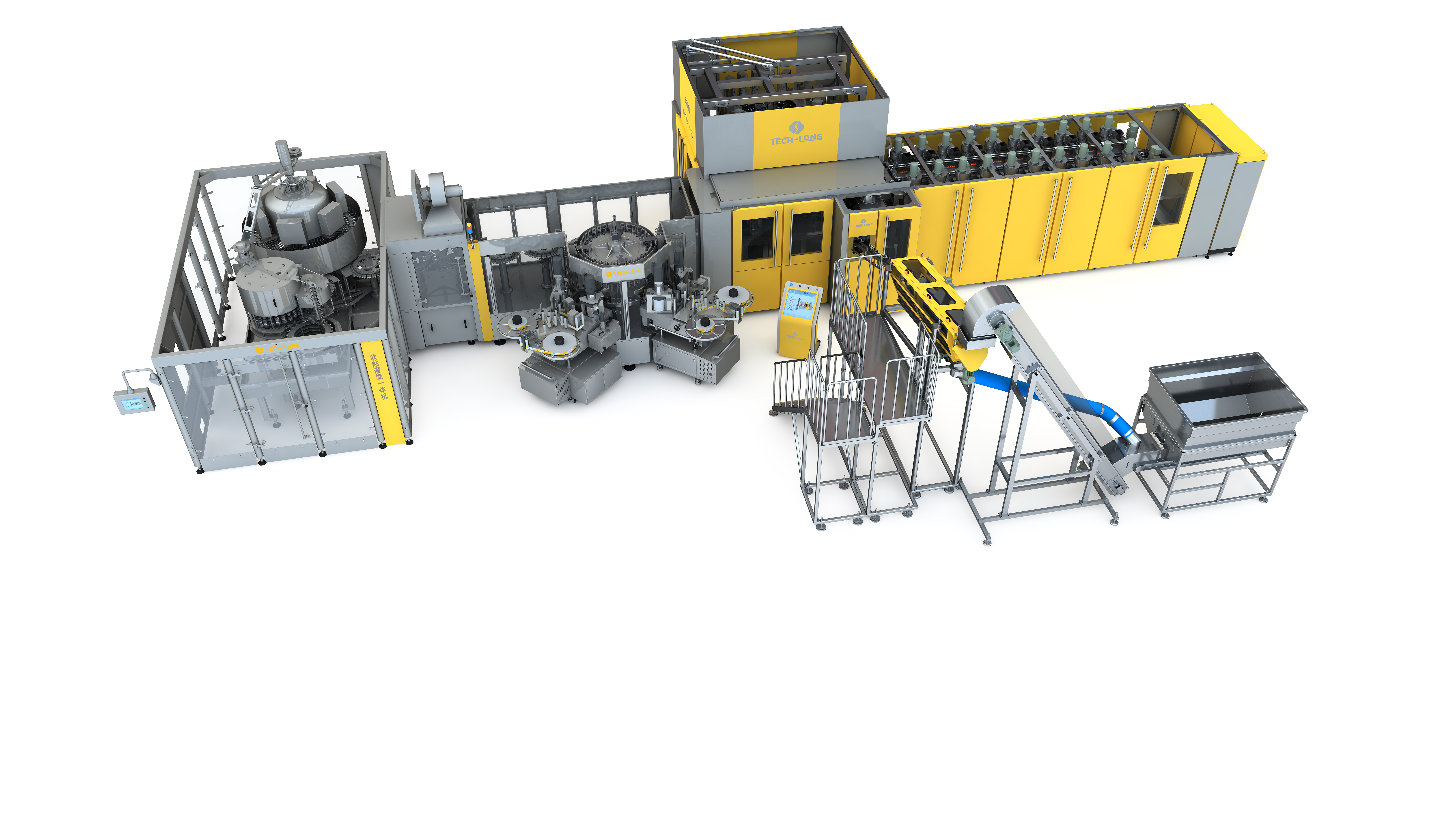 達意隆是吹貼灌旋一體機研發的先行者,我們擁有2000平米的國家級技術中心和800項專利技術。我們研發的全自動吹貼灌旋一體機,與傳統生產線相比,可以節約空間20%~30%,能省去貼標機前端無壓力輸送、瓶身風干系統等設備,操作人員由傳統設備標配的3人減少為1人。